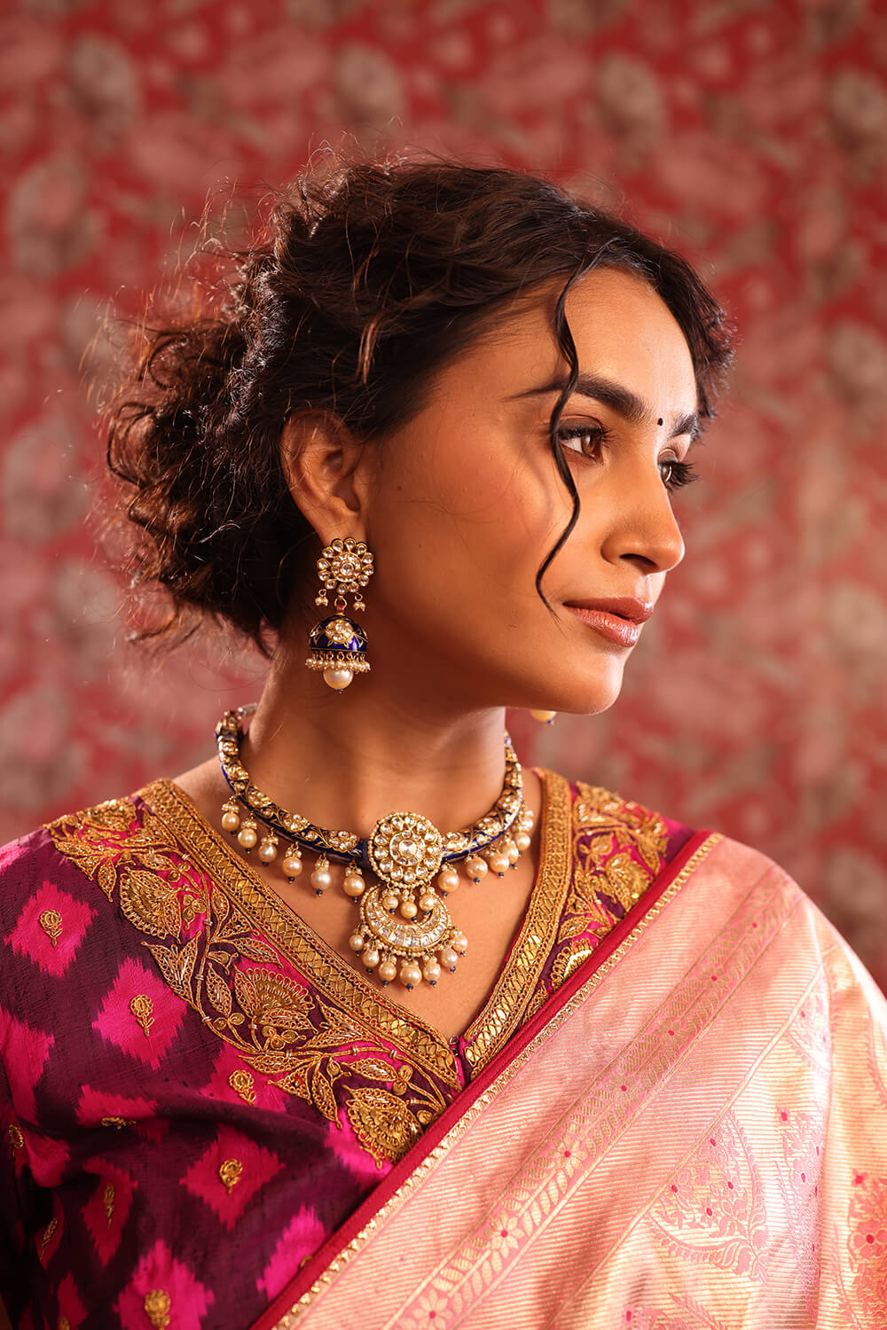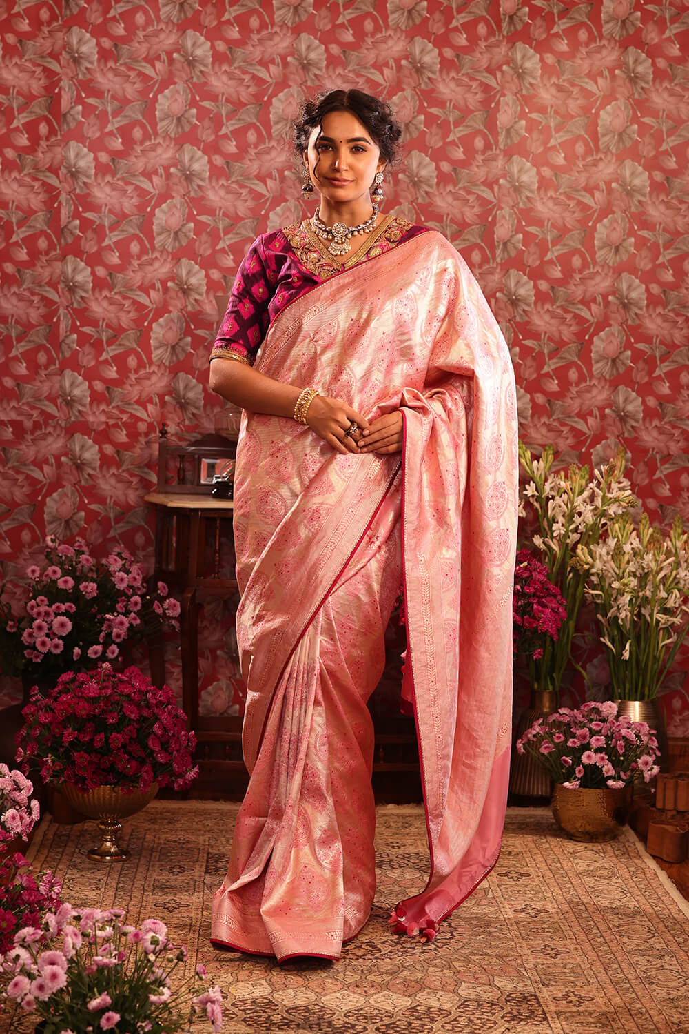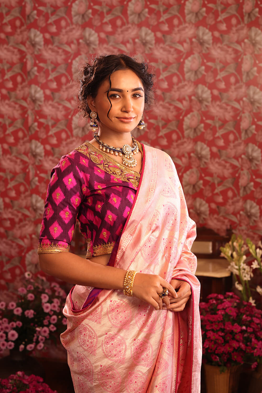 A graceful light pink Banarasi silk saree with all over gold Zari floral motifs. Paired with a contrasting deep purple and magenta Patola style ikat Marodi work blouse.