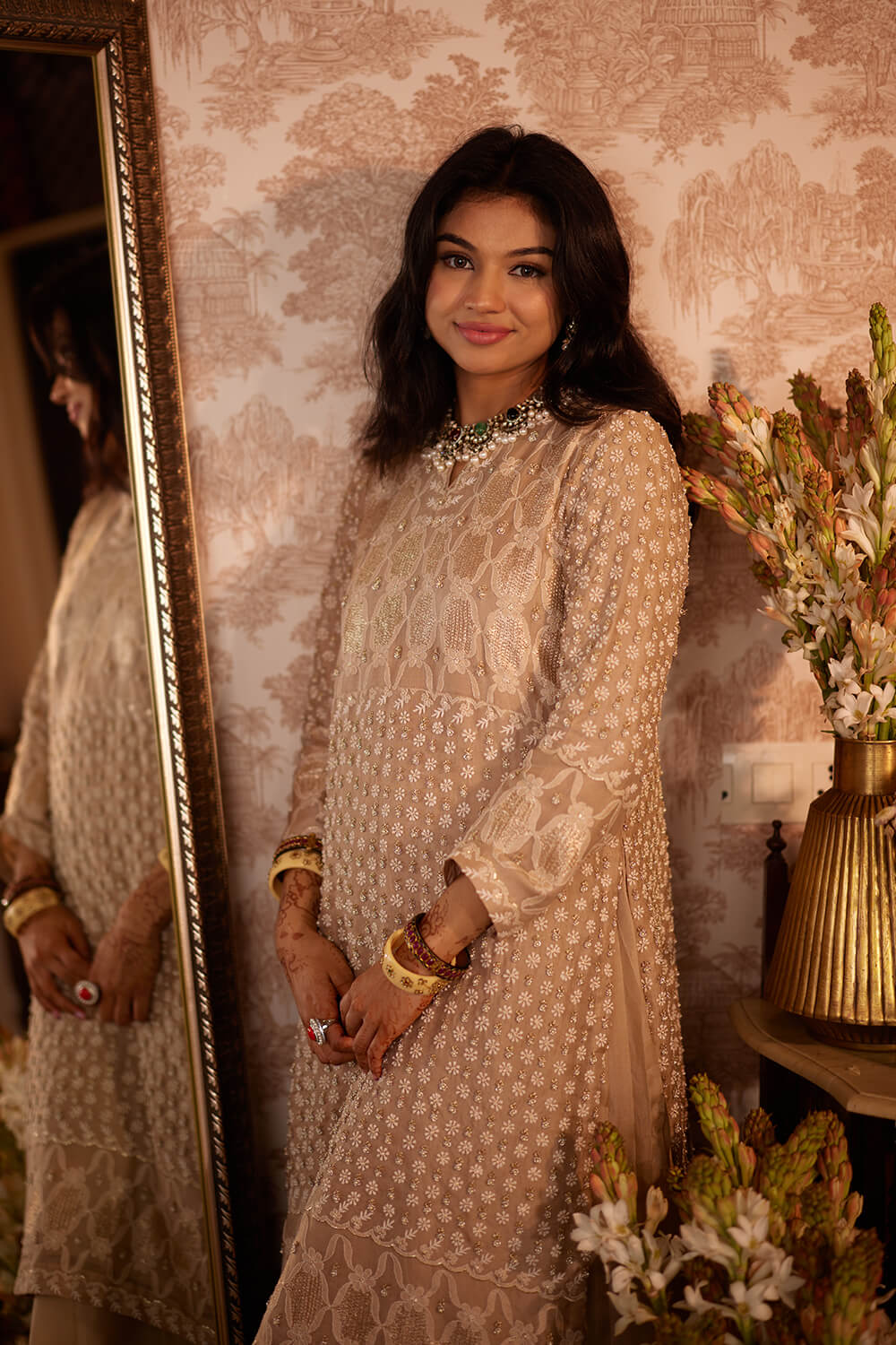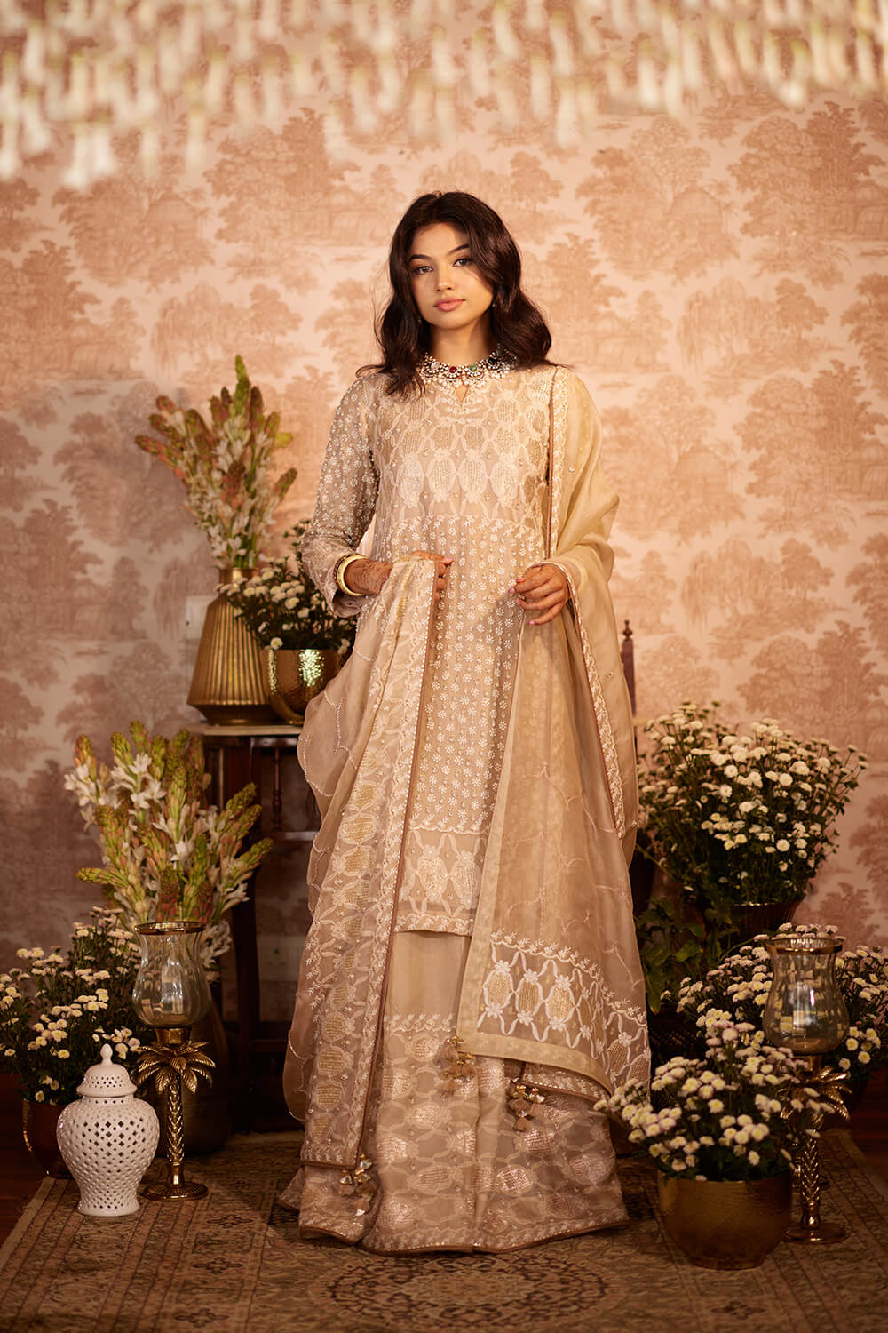 Beige lehenga kurta set with all-over chikankari embroidery and kasab ki jali and zardozi. Paired with a chikankari long skirt and an organza dupatta.