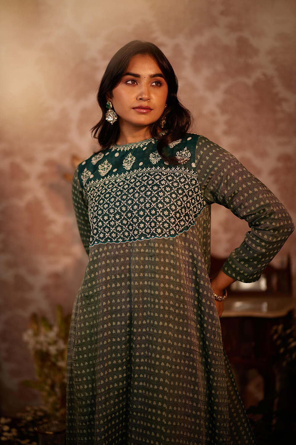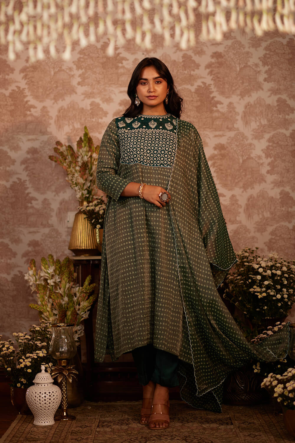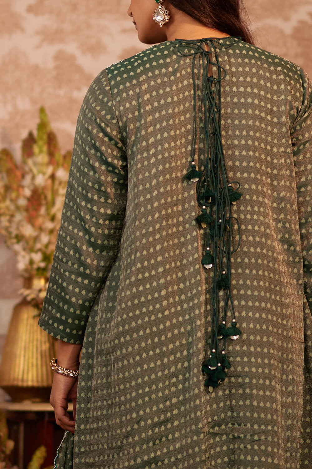 Bottle green block print tissue kurta, with intricately embroidered yoke and back tassel detailing. Paired with satin pants.