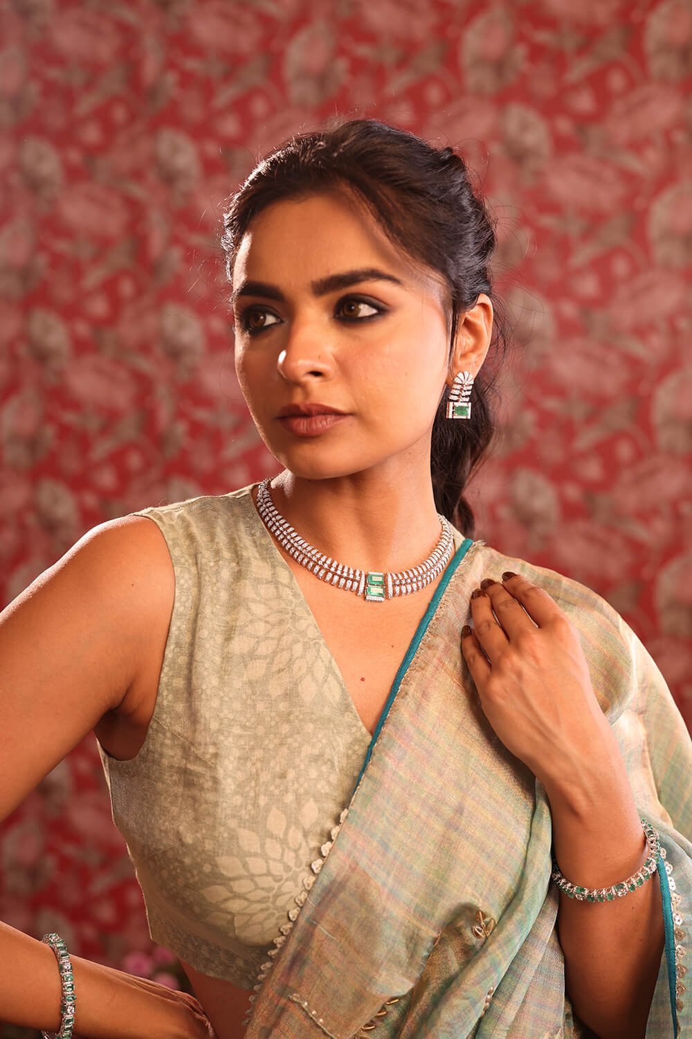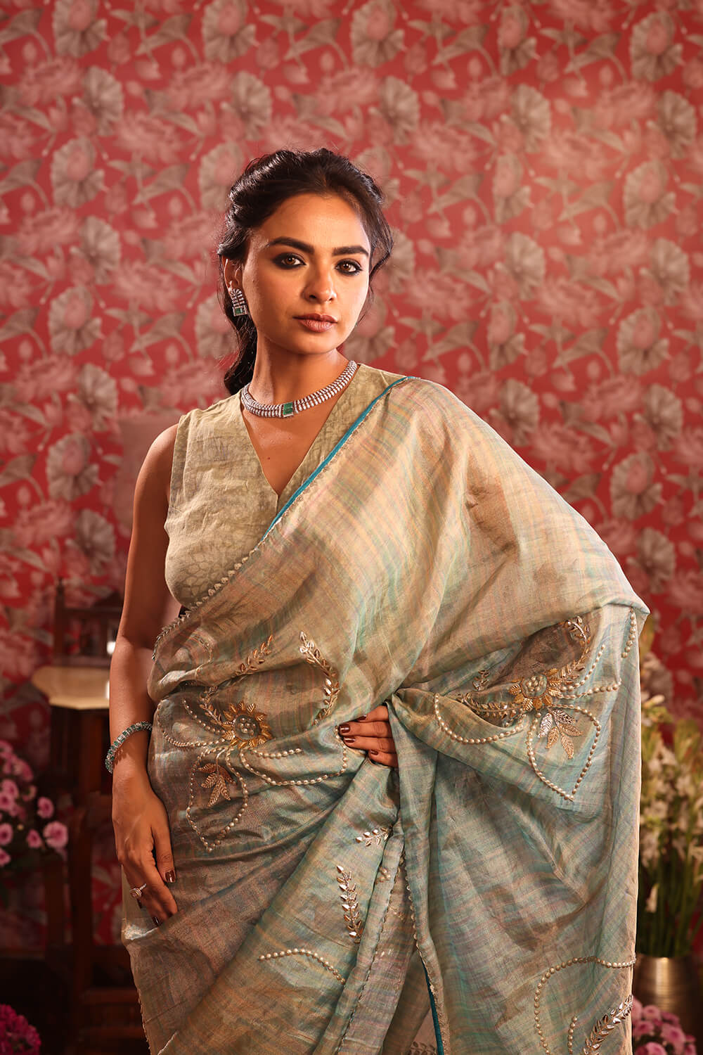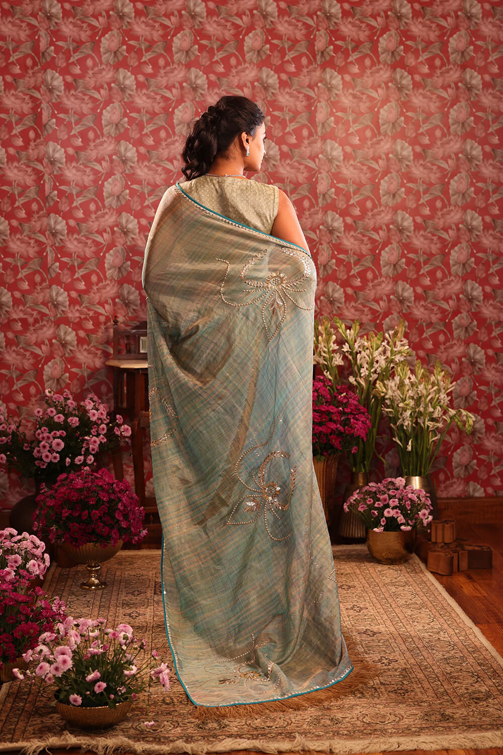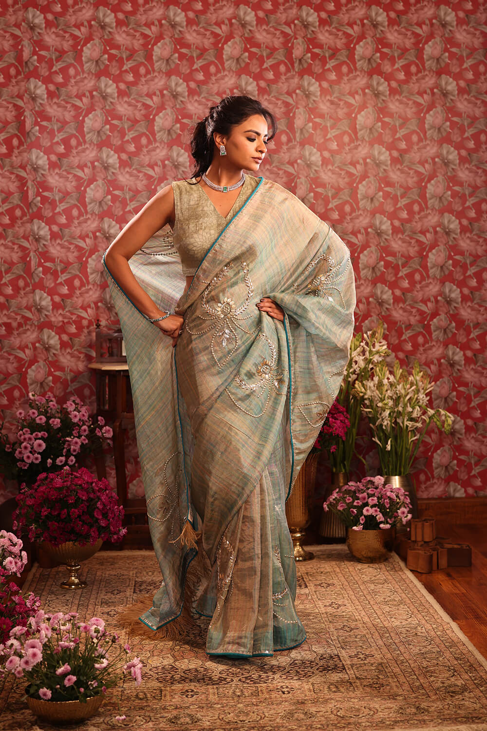 A graceful grey and blue shaded tissue saree. Finished with a subtle shimmering border and paired with a sleeveless blouse.