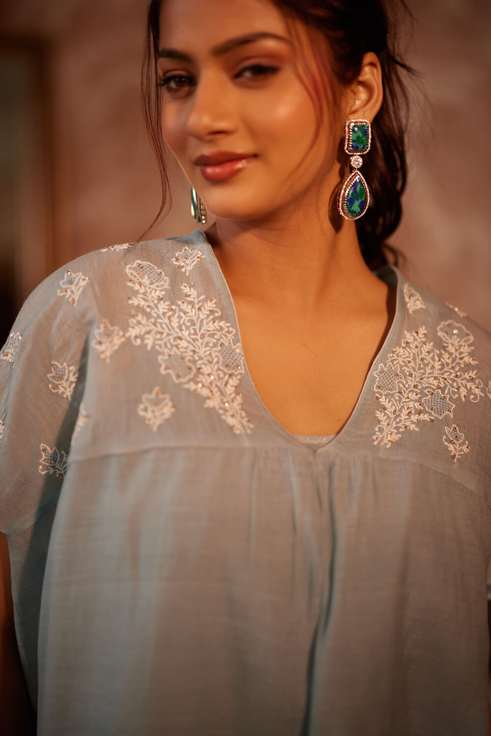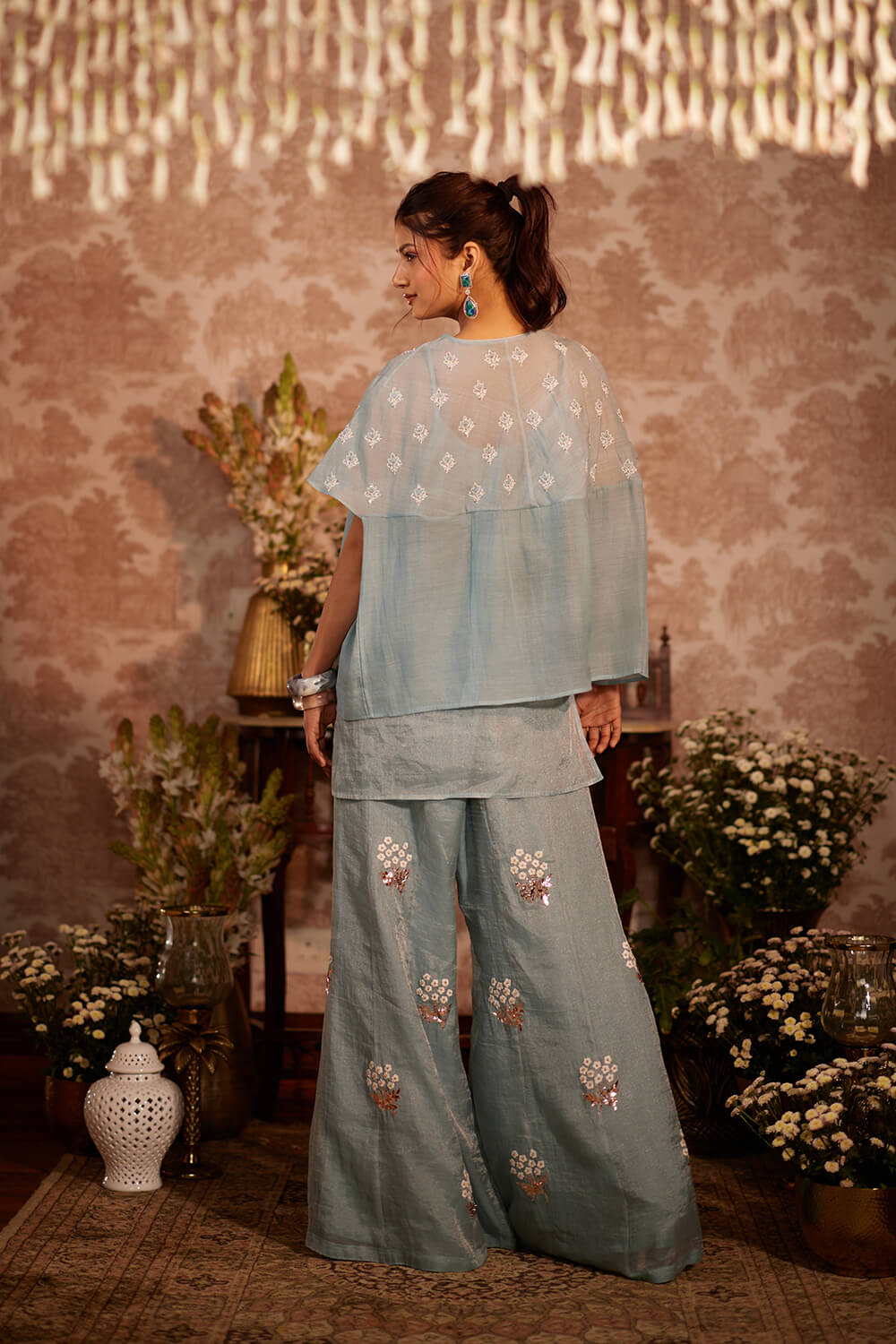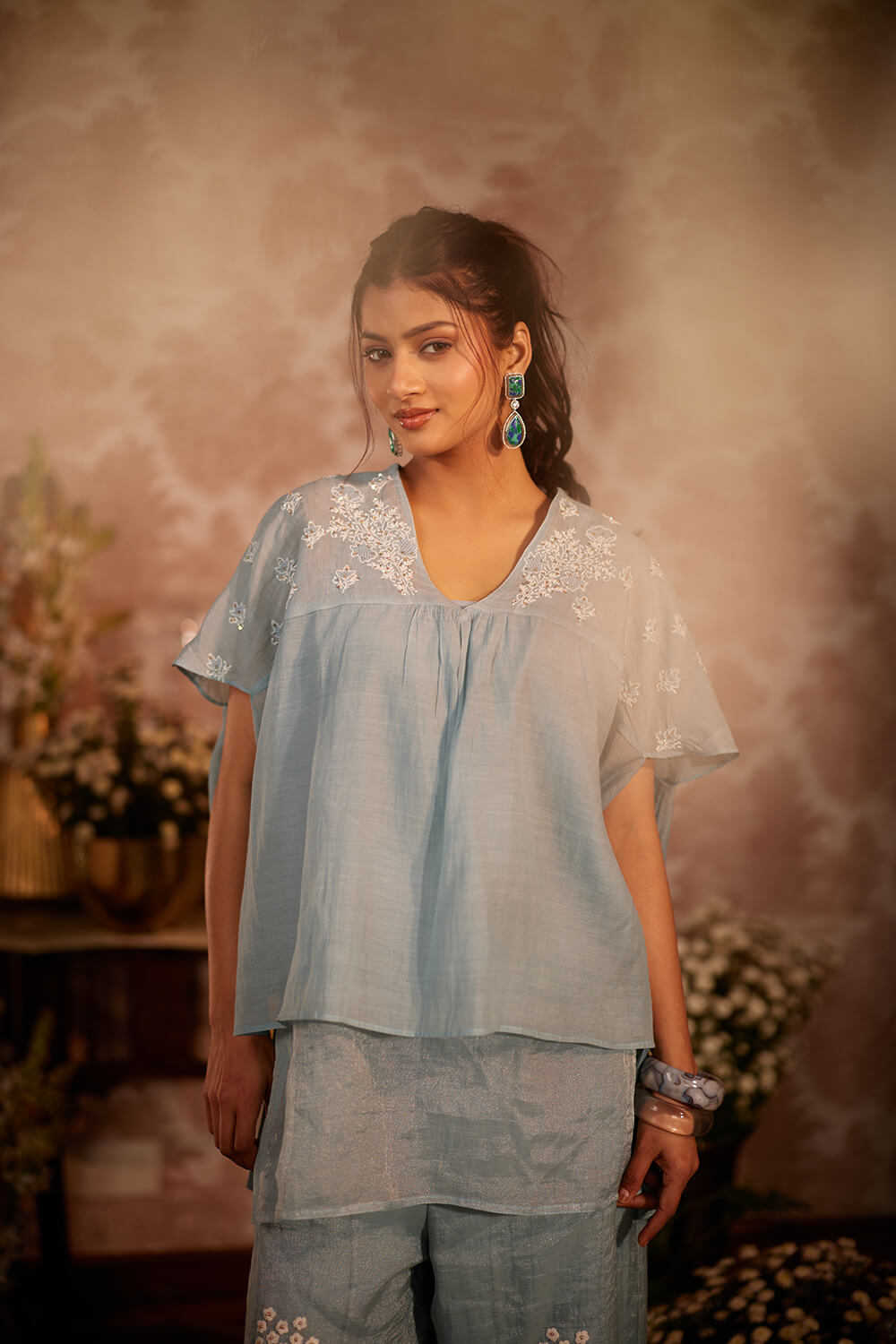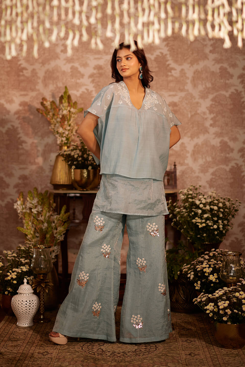 Light Blue cotton silk V-neck top with delicate floral chikankari embroidery along neckline, shoulders and sleeves. Paired with a slip and tissue palazzo pants highlighted with subtle hand embroidery and mukaish bootas.