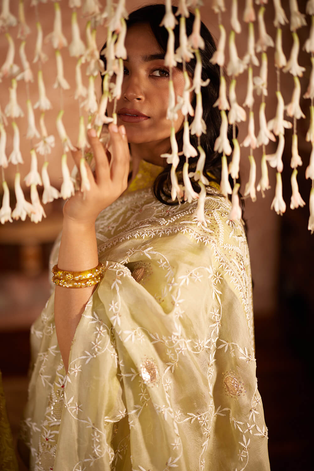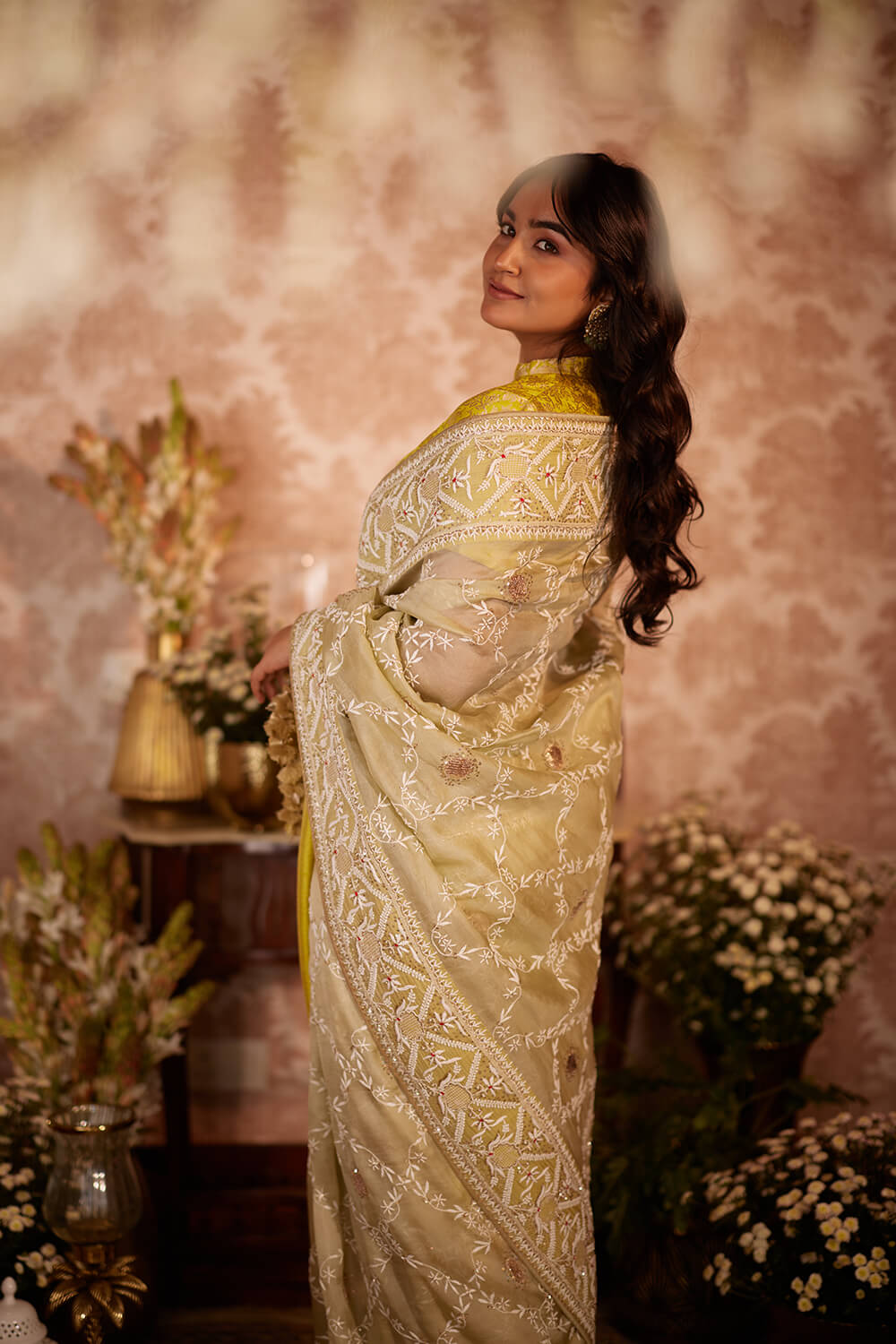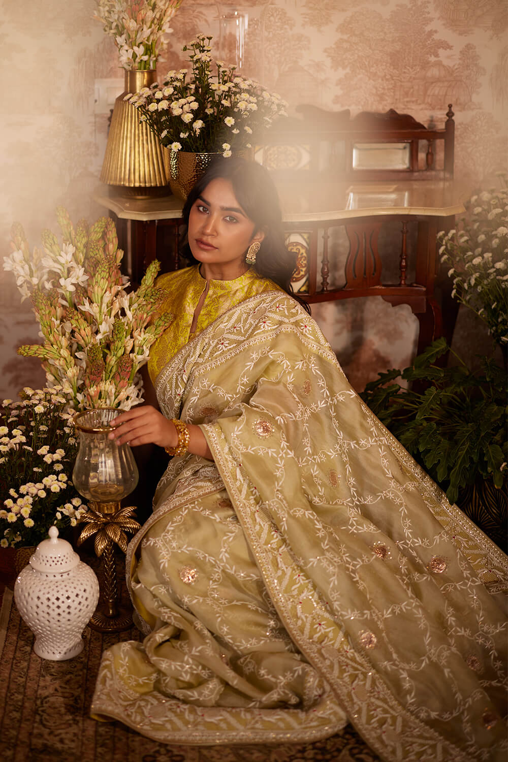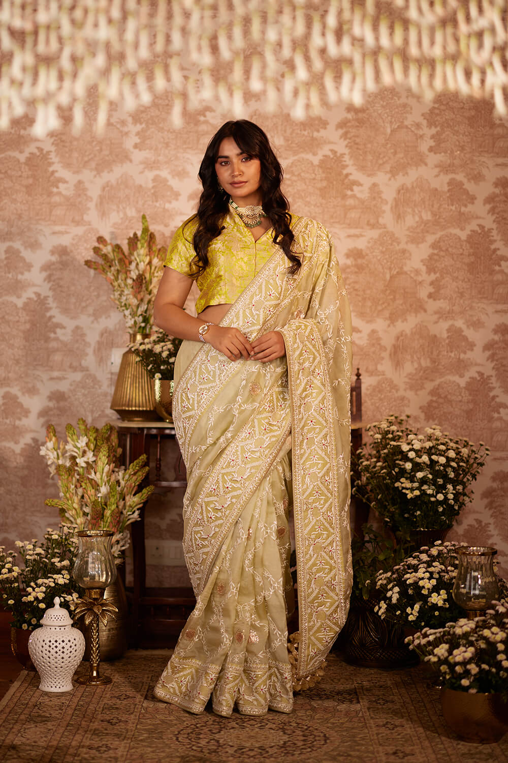 Light Olive organza chikan saree, with delicate all-over chikankari embroidery and finished with intricately embroidered chikan border and tassel detailing. Paired with a lime green brocade blouse.