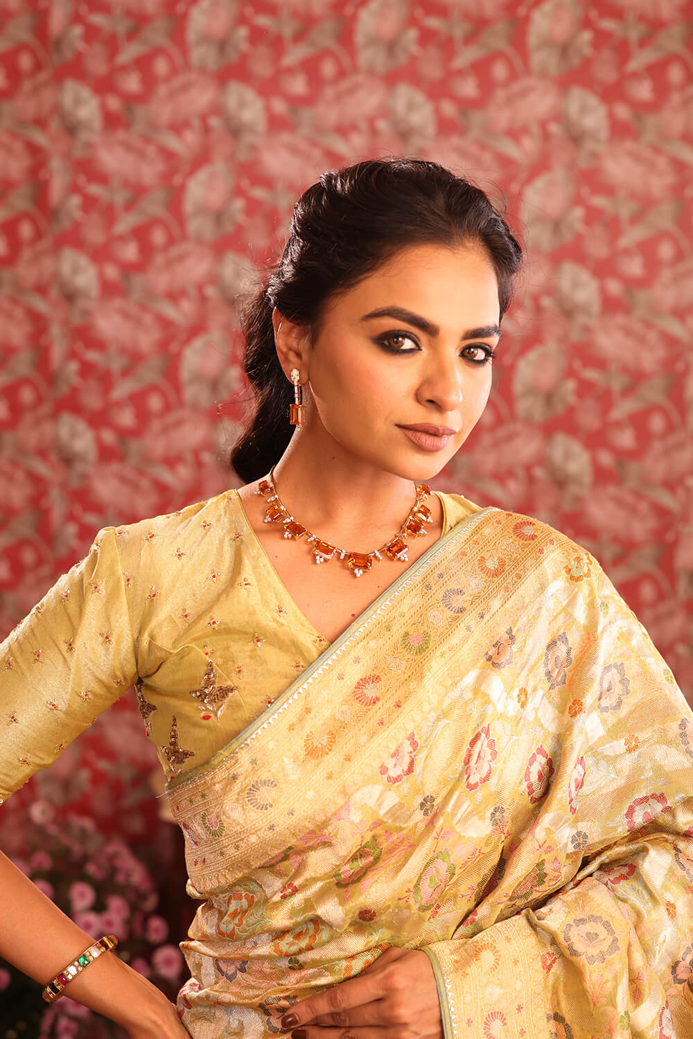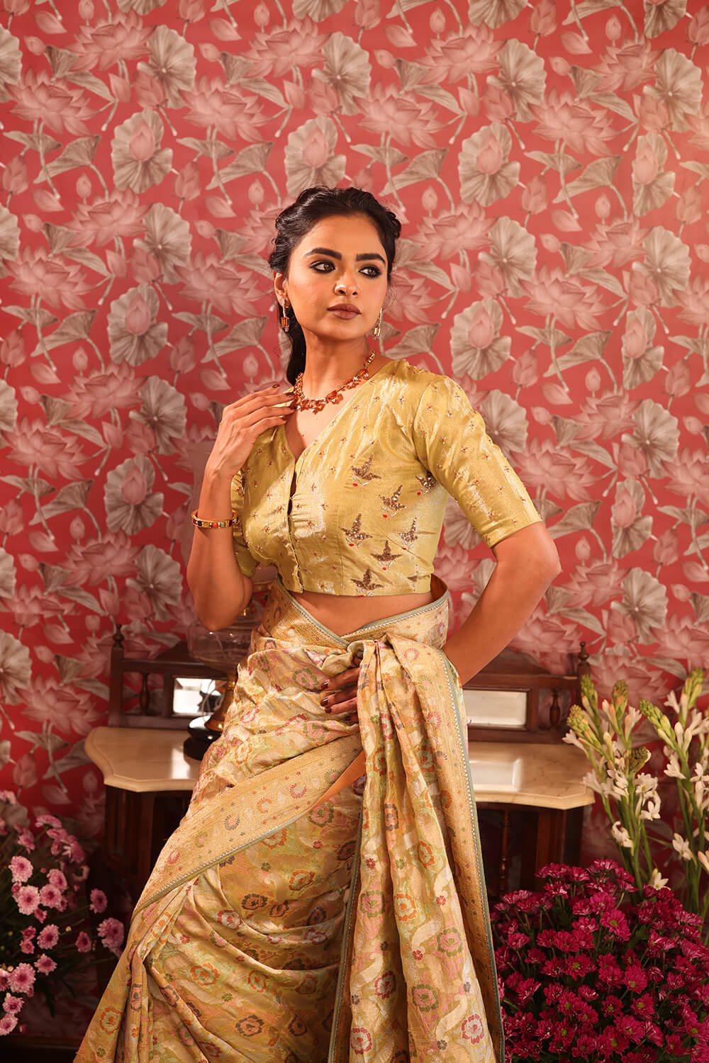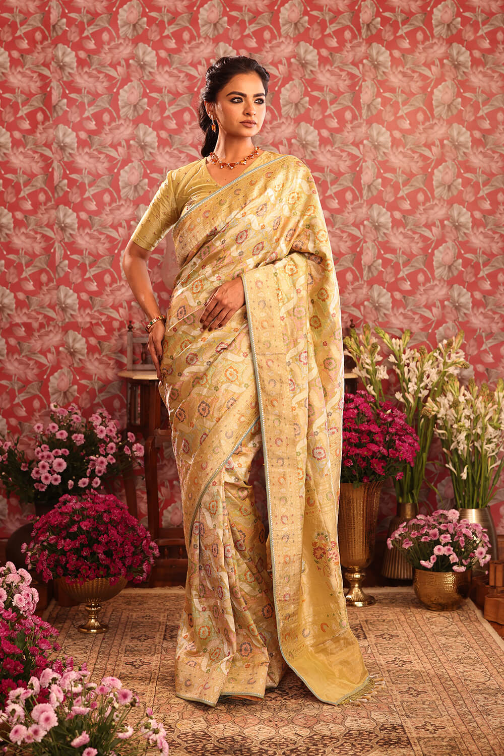 Light olive pure silk tissue Banarasi saree featuring Meenakari weaving in multi colors, paired with a matching tissue zardozi blouse for a rich, traditional look.