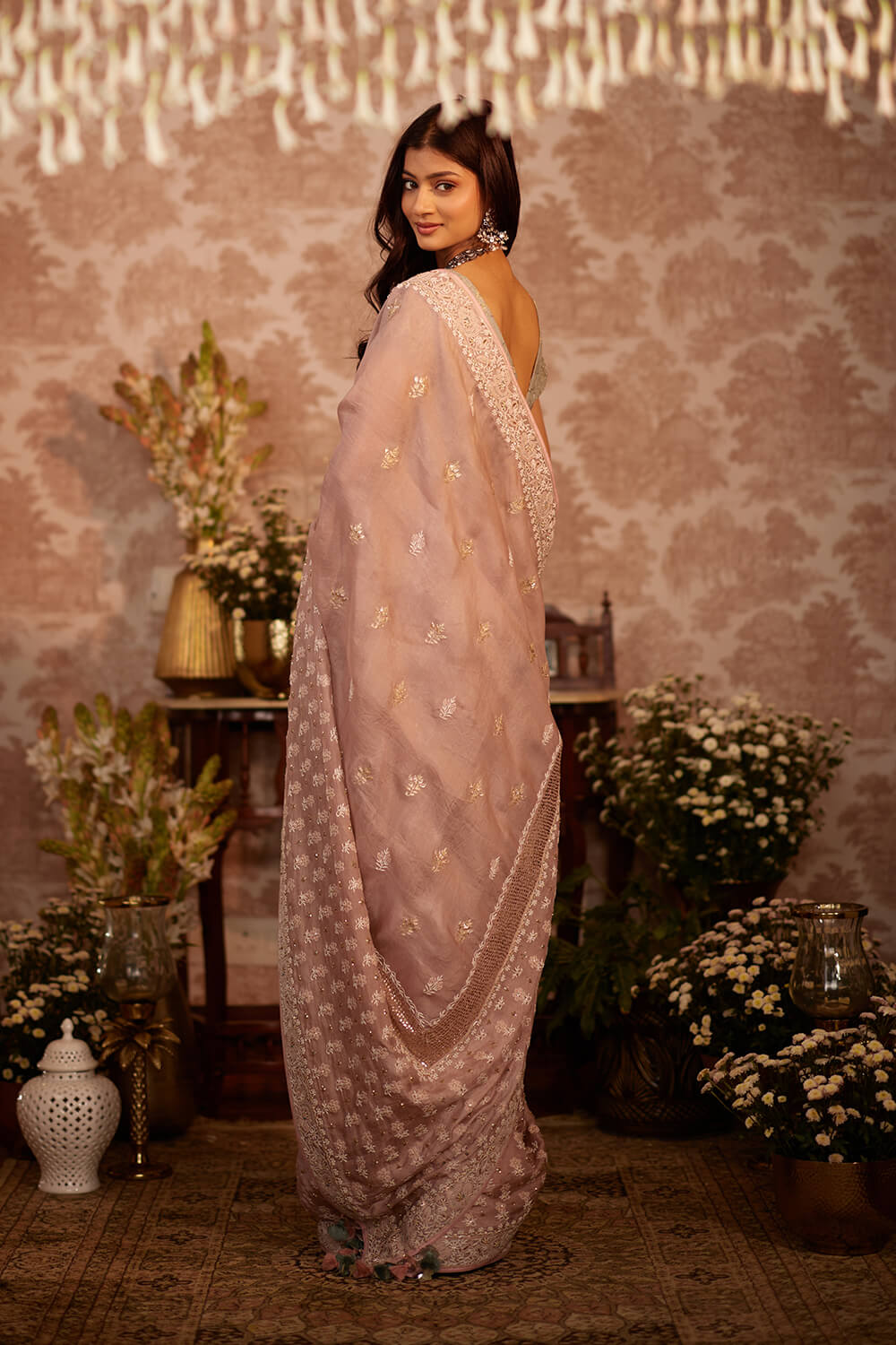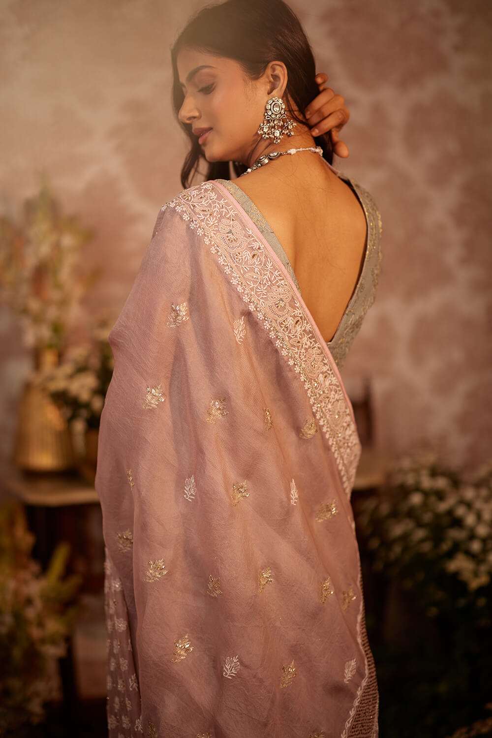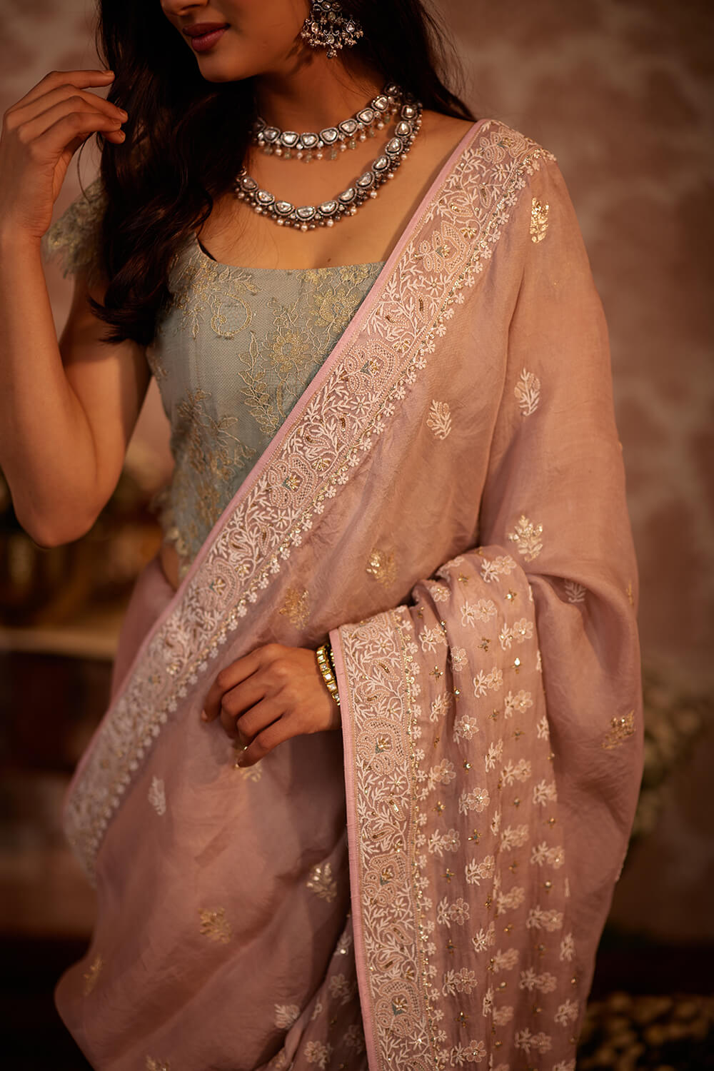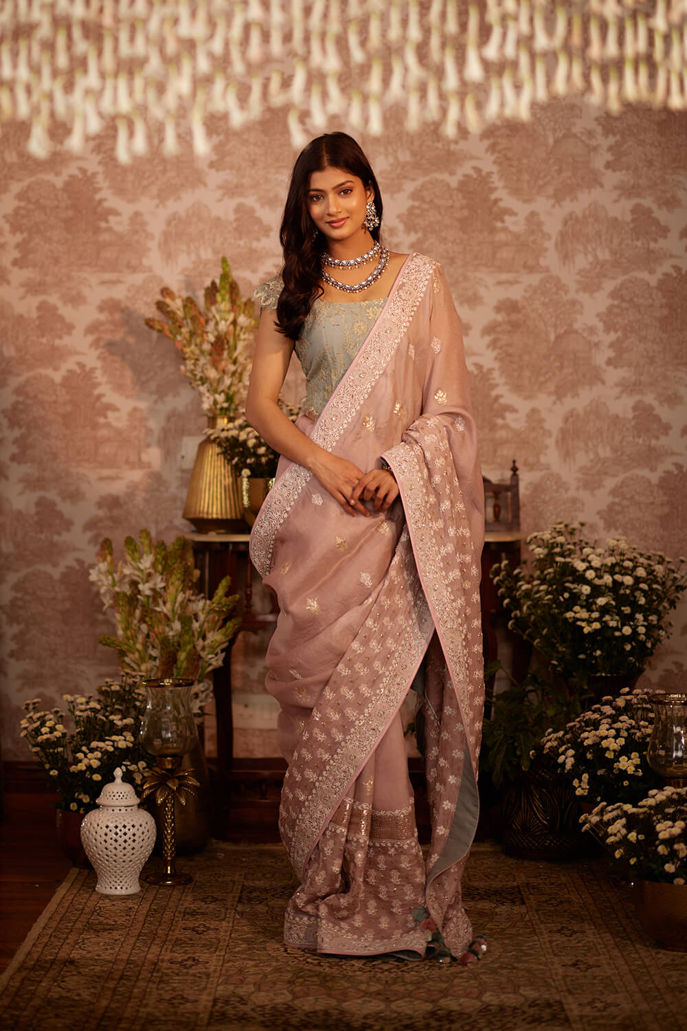 Lilac chikan organza saree, with all-over chikankari embroidery, finished with an intricate chikan border and tassels. Paired with a contrasting green brocade blouse.