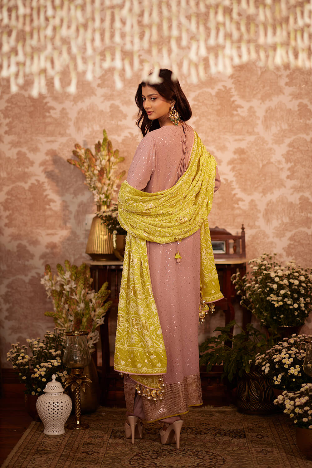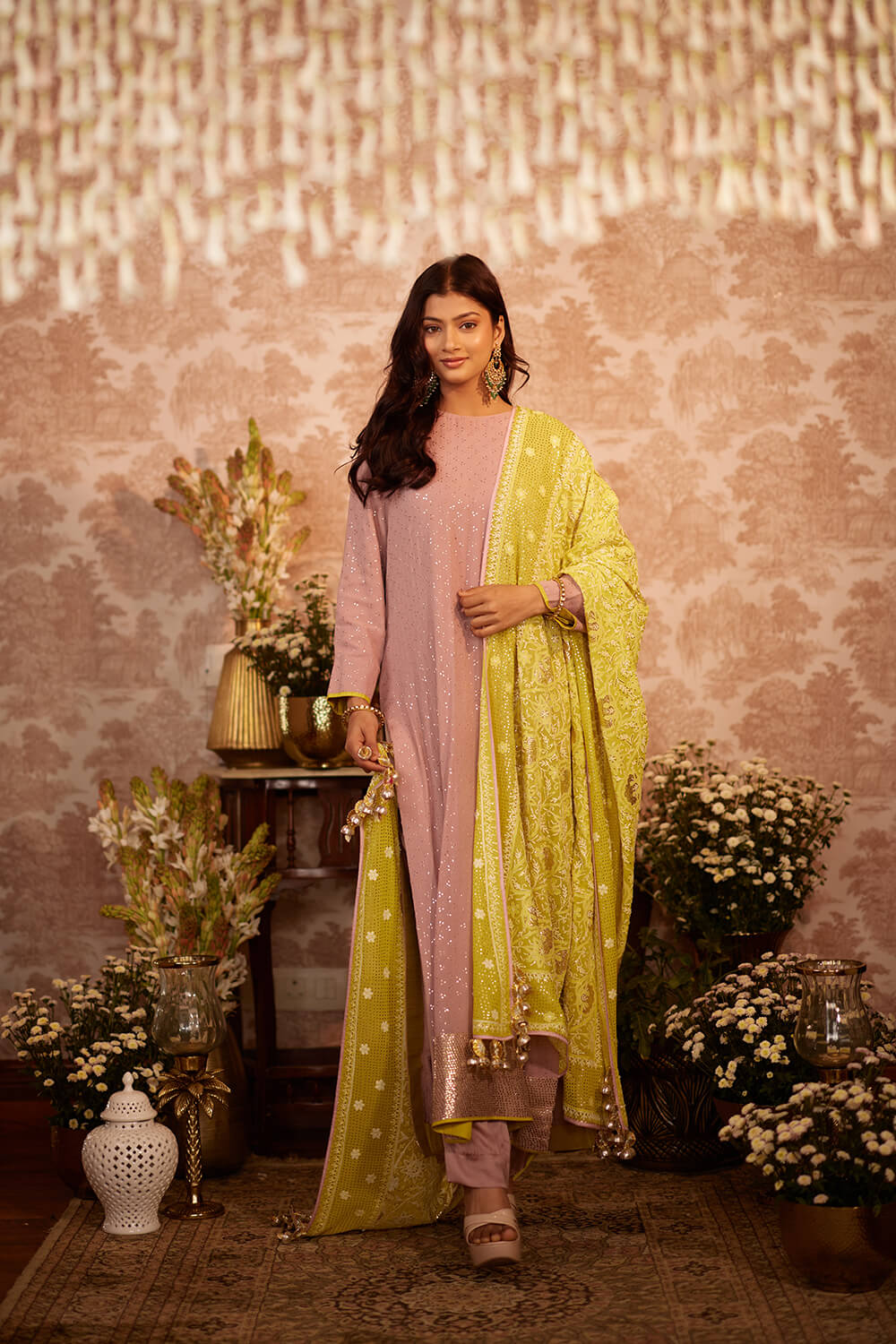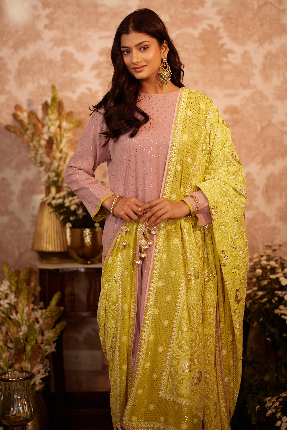 Lilac georgette kurta with delicate all-over mukaish accents. Paired with a contrast lime yellow chiffon dupatta with all-over intricate chikankari embroidery.